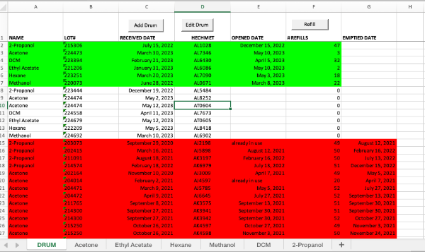 Building upon the concepts in the Receiving Log described above, I created a spreadsheet to track the drums and the individual solvent refills. The HECHMET items shown are hazardous substance inventory barcodes that are the key to matching the refills to the drums.