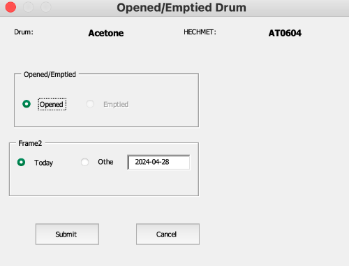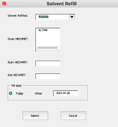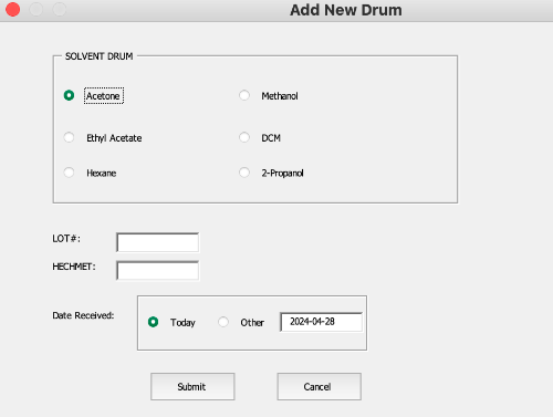 One of my duties at work is refilling solvent bottles in the Solvent Dispensing Facility. Bulk solvent is being transferred from 200 L drums into 4 L bottles. Sometimes impurities are discovered after dispensing and there needs to be a way to determine from which drum the bottle was refilled. Before I took over these duties, there was no way to track this.