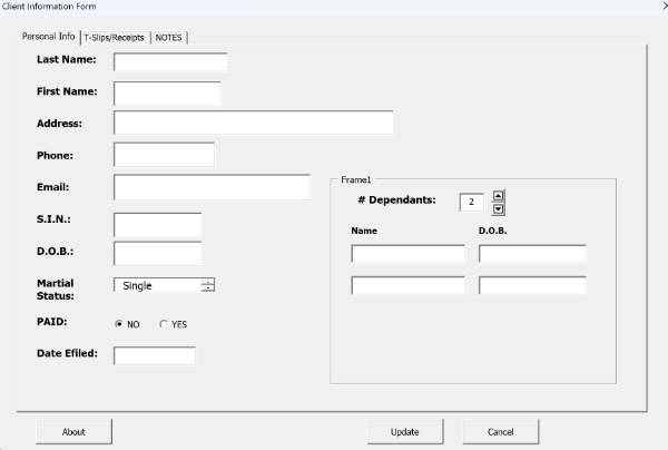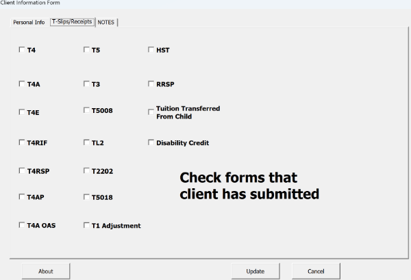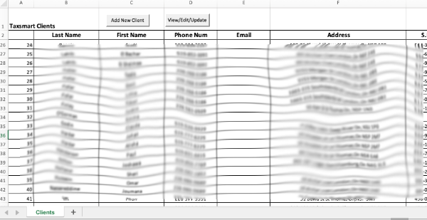 A friend that prepares taxes was keeping her client list in Excel. She wanted an easier way to keep the list updated and keep track of what tax information slips the client provided. I agreed to help and this is what I came up with.
